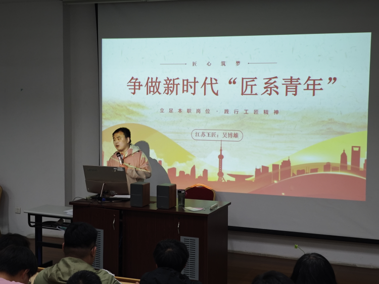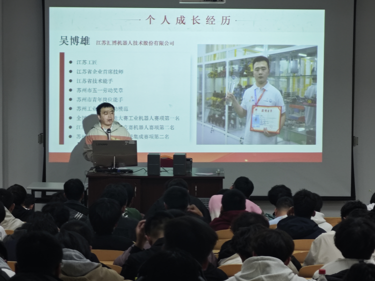 2024年11月12日,江苏汇博机器人技术股份有限公司电气工程师吴博雄应邀来到金沙官网工学院,进行了题为“争做新时代‘匠系青年’——机电一体化技术职业规划”的专题讲座。讲座由工学院党总支书记李永泰主持,旨在帮助学生树立职业理想,明确未来发展方向,培养工匠精神。