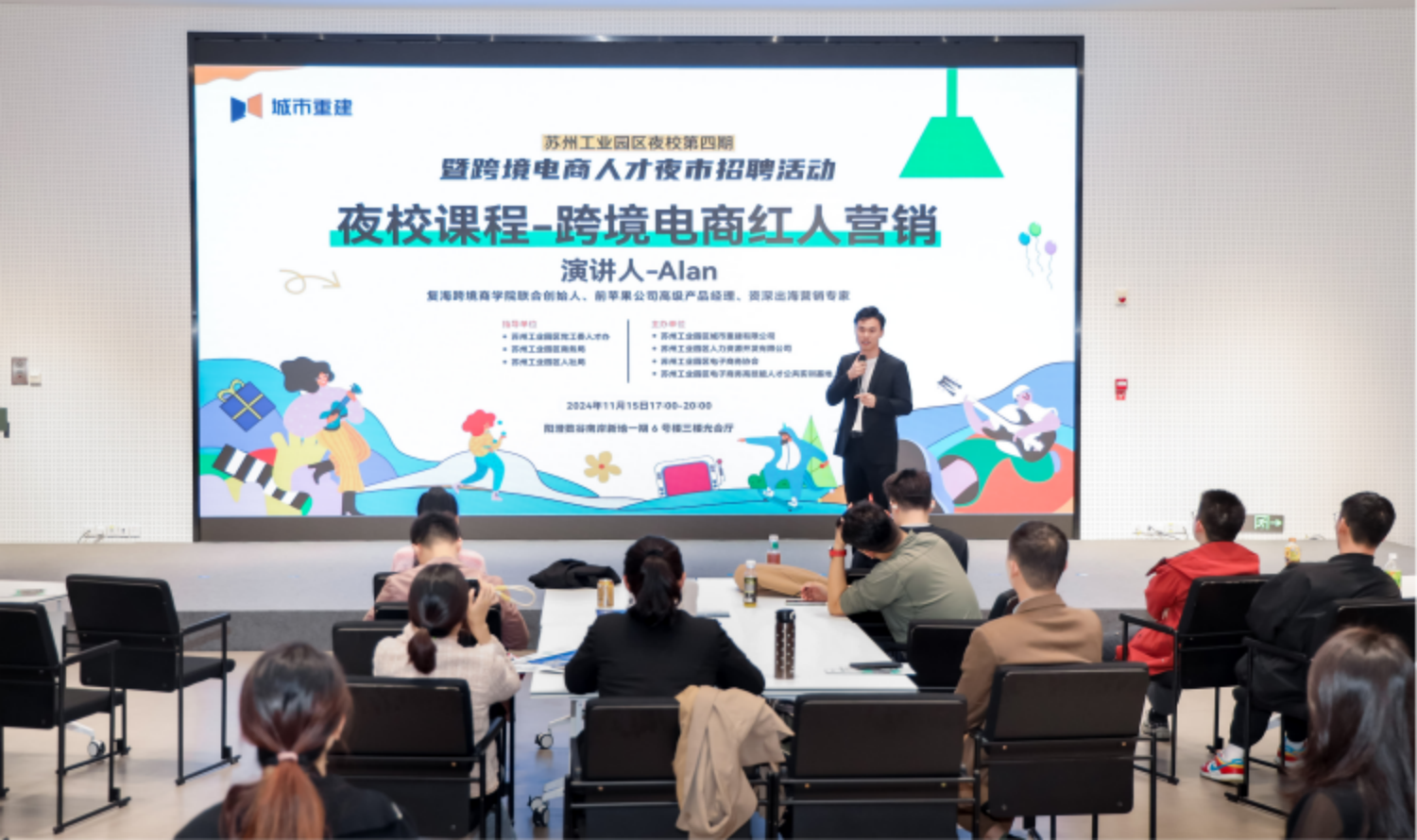 2024年11月15日,商学院院长助理何慧琳老师带领商学院部分师生参加了由苏州工业园区城市重建有限公司、苏州工业园区人力资源开发有限公司、苏州工业园区电子商务协会及苏州工业园区电子商务高技能人才公共实训基地联合主办的跨境电商人才夜市招聘活动。本次活动在阳澄数谷南岸新地举办,旨在搭建求职者与跨境电商企业之间的桥梁,同时提供夜校课程,让学习与求职并行不悖。