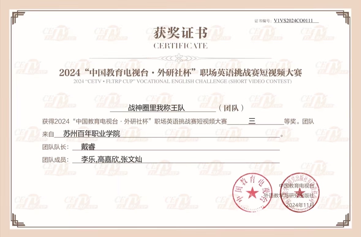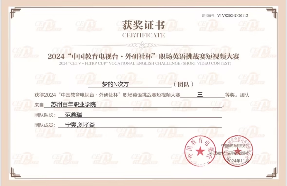 2024年11月15日,由中国教育电视台与外语教学与研究出版社主办的首届“中国教育电视台・外研社杯”职场英语挑战赛英语短视频大赛圆满落幕。经过两个月的激烈角逐,全国131所院校的学生团体在决赛中展开了激烈比拼最终金沙官网两支参赛团队,在李敏老师与朱婧雯老师的指导下,凭借出色的表现分别荣获三等奖。