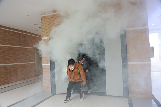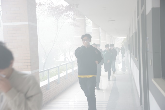 下午15:30,随着消防警报的响起,演练正式开始。教学楼内模拟烟雾弥漫,师生们在疏散引导员的指挥下,用湿毛巾捂住口鼻,弯腰低姿,按照预定路线迅速撤离。整个疏散过程紧张有序,仅用时2分半钟,全体参演师生便安全撤离至篮球场集合点。随后,各学院清点人数并逐级上报,确保无一人遗漏。