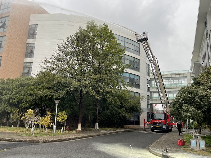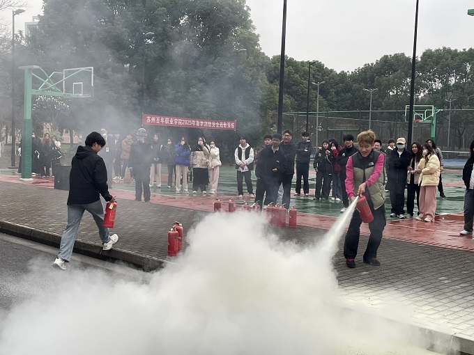 演练结束后,独墅湖消防中队队长刘洪潭为师生们进行了消防安全知识培训,详细讲解了灭火器的类型及正确使用方法,并邀请师生及物业公司代表现场操作灭火器扑灭模拟火源。最后,消防中队还给师生们现场进行了新型消防车高压喷水灭火表演,让大家近距离的感受到了消防科技的发展与进步。