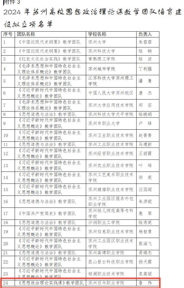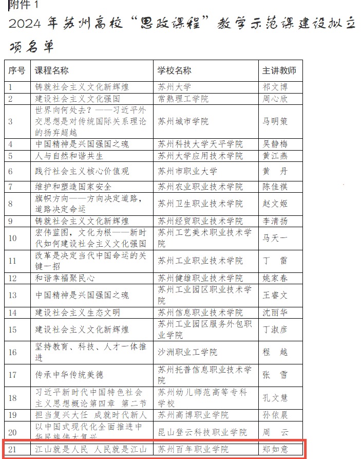 近期,苏州市教育局公布了《关于公布2024年苏州高校“思政课程”和“课程思政”教学示范课、思想政治理论课教学团队培育建设项目名单的通知》(苏教高〔2025〕1号)文件,金沙官网《思政理论实践课教学团队》入选苏州高校思想政治理论教学团队培育建设项目名单,《江山就是人民 人民就是江山》章节教学设计入选苏州高校“思政课程”教学示范课,标志着金沙官网在思想政治理论实践课建设方面阶段性成果。