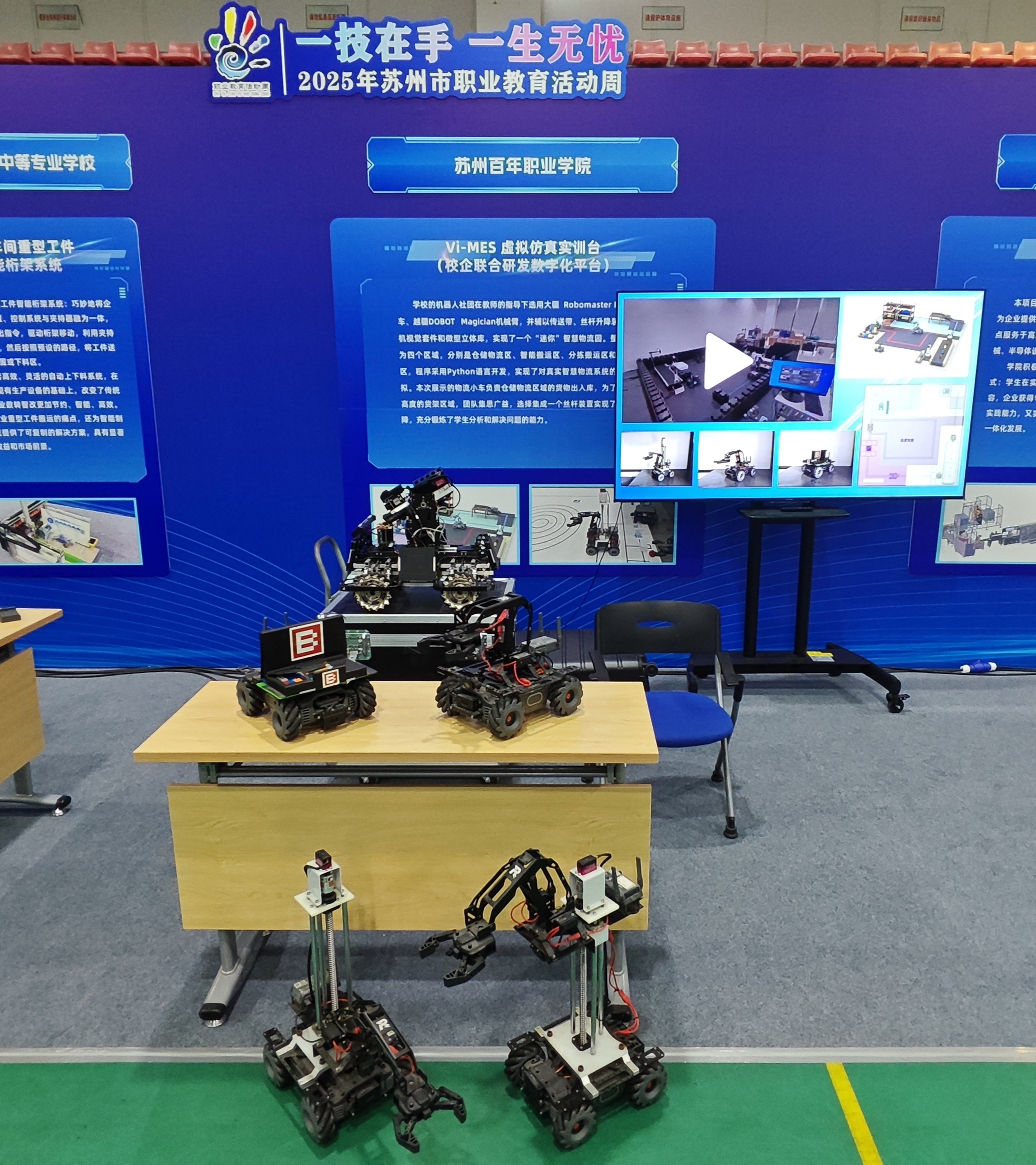 在本次职业教育活动周上,学校机器人社团的智慧物流园项目精彩亮相。该项目在工学院师生的合作下,充分利用大疆Robomaster EP智能小车、越疆DOBOT Magician机械臂等行业前沿设备,结合传送带、丝杆升降装置、计算机视觉套件和微型立体库等辅助设施,成功搭建了一个高度仿真的“迷你”智慧物流园,充分体现了学校在职业教育领域的实践教学成果。