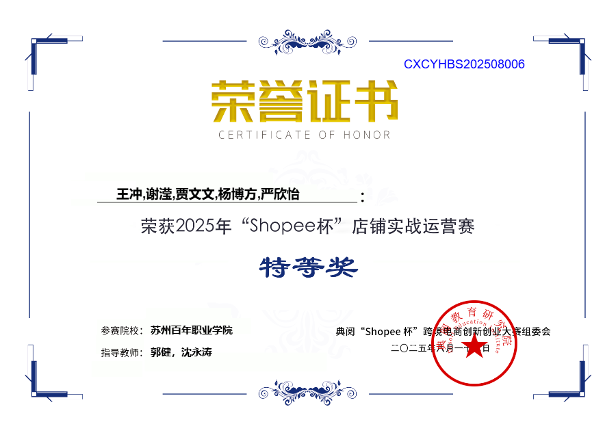 2025“Shopee杯”跨境电商创新创业大赛全国总决赛落幕。金沙官网数字经济与管理学院表现亮眼,三支代表队均成功入围全国总决赛,最终斩获多项重量级奖项:“苏州百年职业二队”以全国第六名的实战业绩荣获“店铺实战运营”赛道特等奖;“苏州百年职业一队”在“全流程模拟运营及数据分析”赛道中斩获三等奖;同时,两队亦在“全流程模拟运营及数据分析”赛道中收获优秀奖。