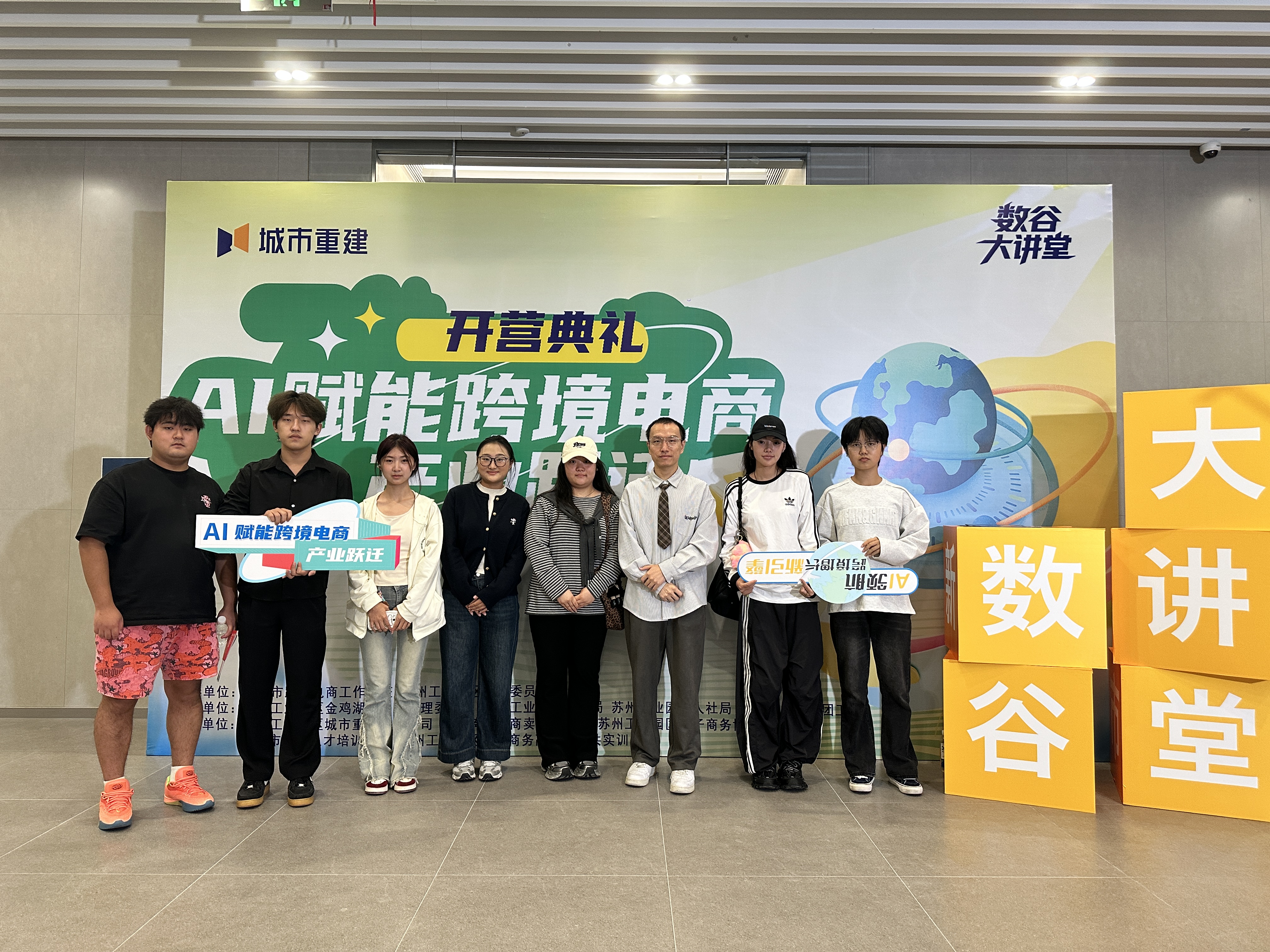 10月14日,数字经济与管理学院副院长(主持工作)汪林利、副院长张柯冉、辅导员周逸霄的带领该院电子商务专业学生代表,前往阳澄数谷·南岸新地参加“AI赋能跨境电商产业跃迁开营典礼暨数谷大讲堂开学第一课”,体验了一场富有实效的校外实践教学活动。