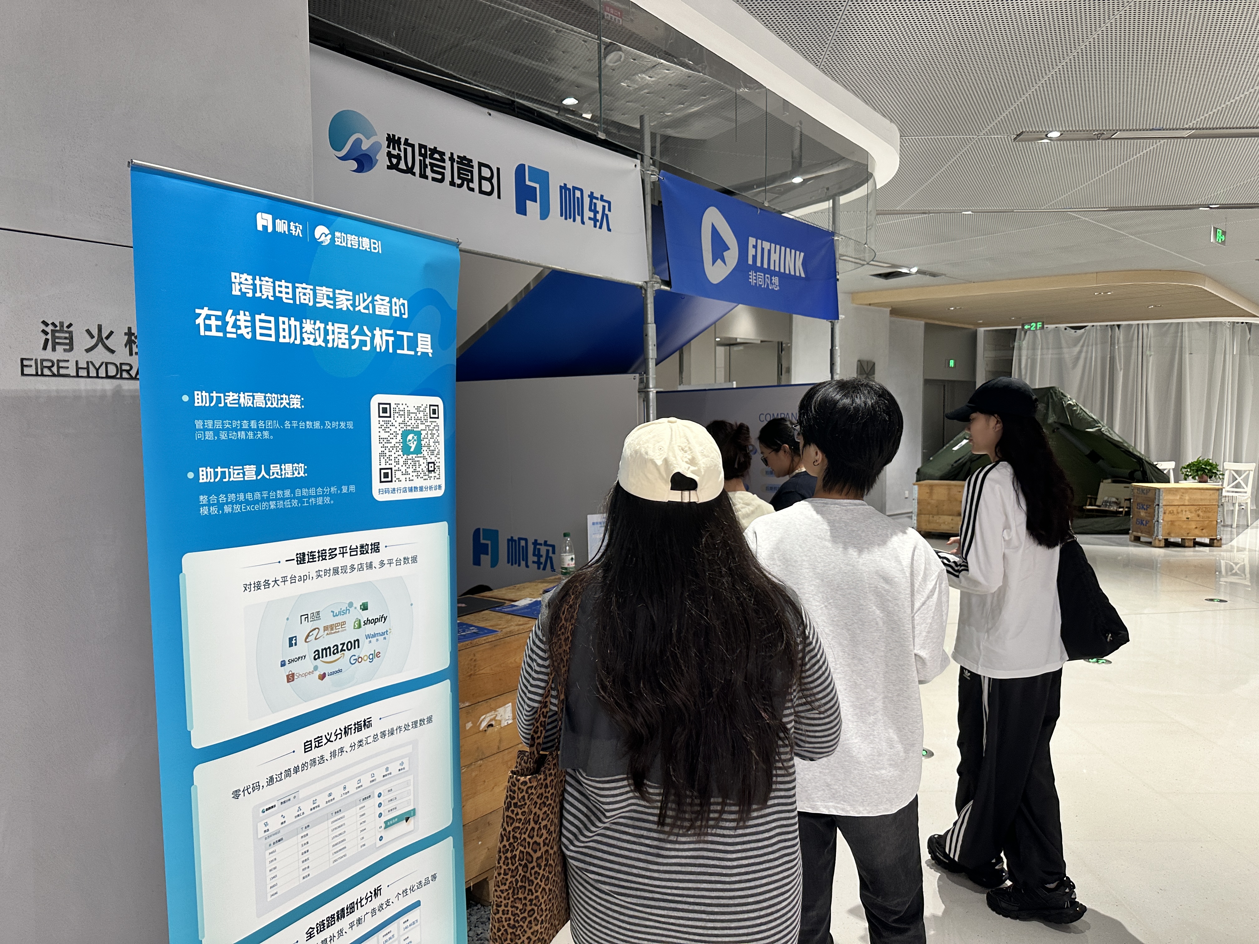 “AI×跨境电商创新市集”环节,同学们与参展企业交流,接触了AI驱动的跨境电商服务,从智能选品、营销推广到物流优化,前沿AI产品与服务让同学们对“AI+跨境电商”的融合趋势有了更直观的理解。