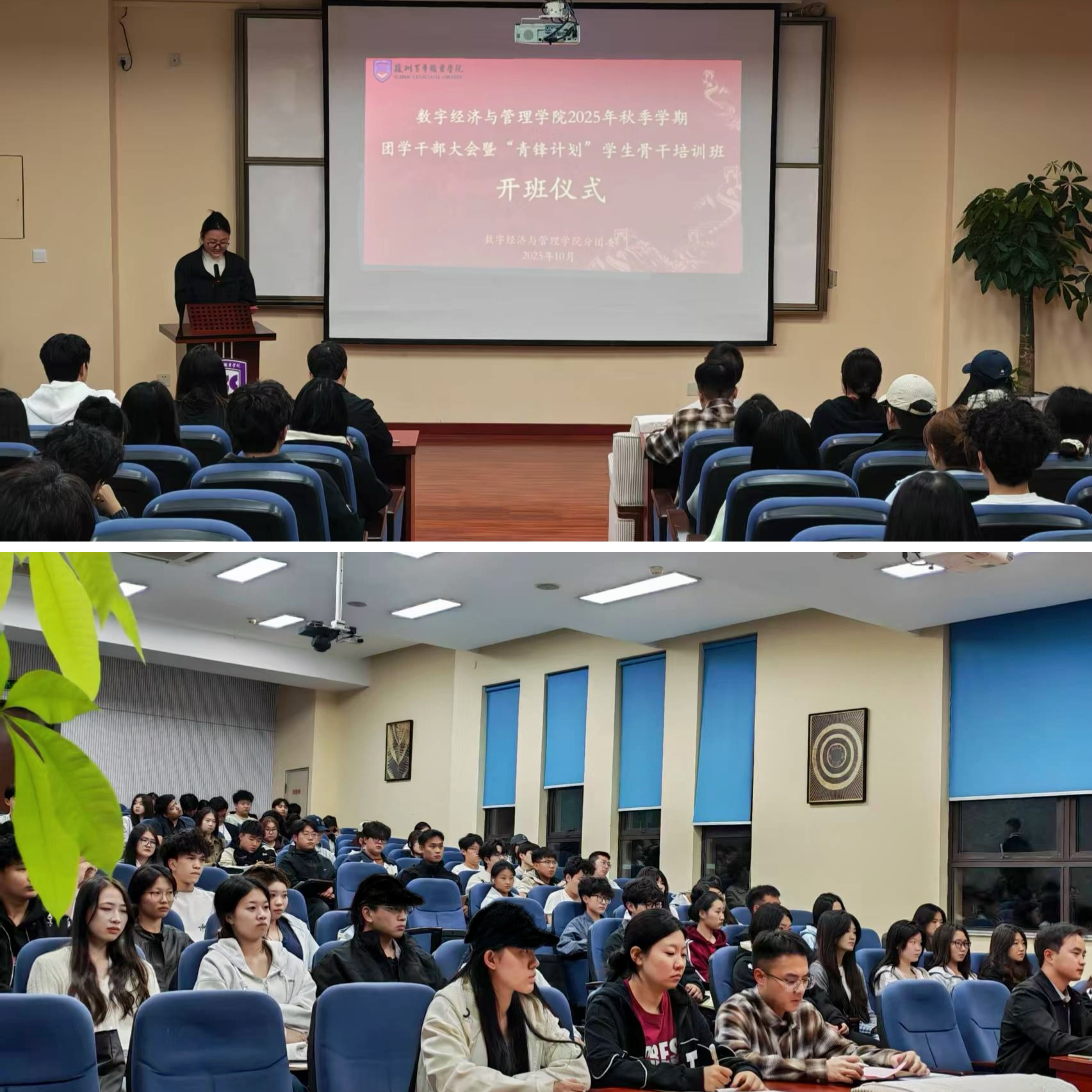 为切实提升学院学生干部履职能力与综合素质,强化团学组织“服务同学、凝聚青年”的职能,10月20日晚,数字经济与管理学院分团委顺利开展2025年秋季学期团学干部大会暨“青锋计划”学生骨干培训班开班仪式。数字经济与管理学院副院长、党总支副书记卜少康、学院分团委书记闫阿伟、青年先锋队指导教师陈家豪及130余名学生干部共同参加了开班仪式。