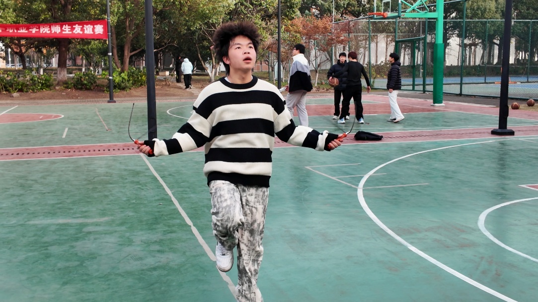 单人跳绳赛场上,是个人速度与耐力的比拼,选手们争分夺秒,不断挑战自我的极限,来自大数据2401班华梓翔同学以一分钟213个的惊人成绩获得单人跳绳冠军。