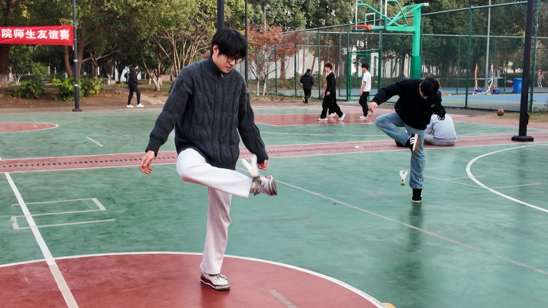 五彩的毽子在选手脚上轻盈起落,这项比赛不仅比拼数量,更考验选手的平衡与技巧,展现了同学们专注、沉稳的一面。来自大数据2401班华梓翔同学以一分钟56个的成绩再次斩获单人踢毽子比赛冠军。