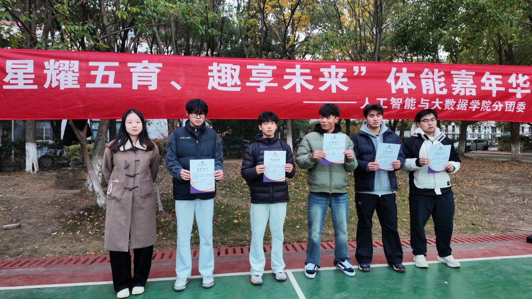 “星耀五育、趣享未来”体能嘉年华活动不仅是一次成功的体能锻炼与趣味竞赛,更是一堂生动的“五育并举”实践课。参赛选手和获奖同学们脸上洋溢着自豪与喜悦的笑容,手中荣誉证书不仅是对运动成绩的肯定,更是对他们拼搏精神与团队荣誉感的最高褒奖。人工智能与大数据学院将继续创新育人形式,搭建多元平台,助力每一位学子成长为体魄强健、精神充盈、能力卓越的复合型人才,以最饱满的姿态迎接新时代的挑战。