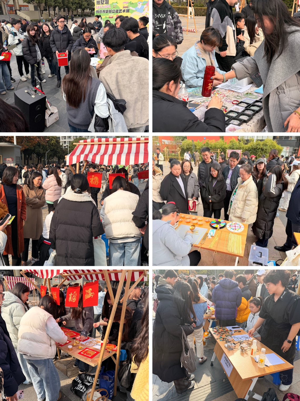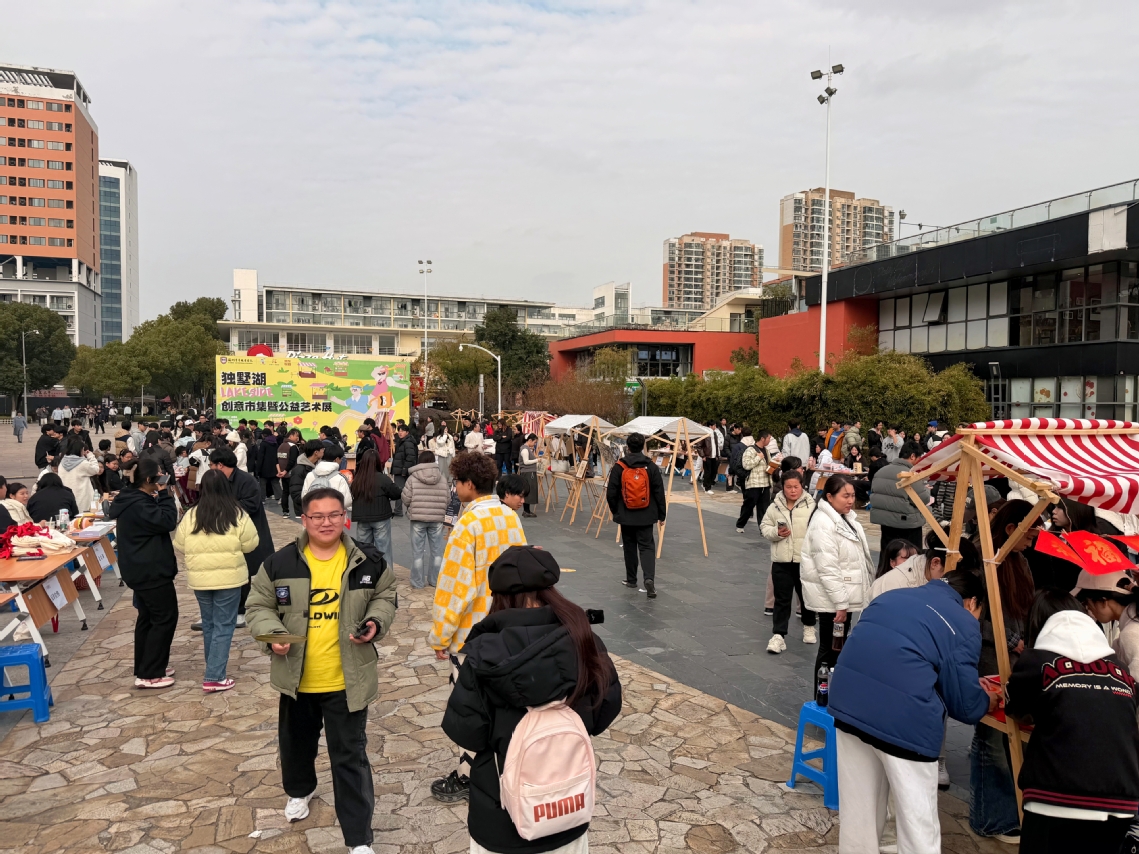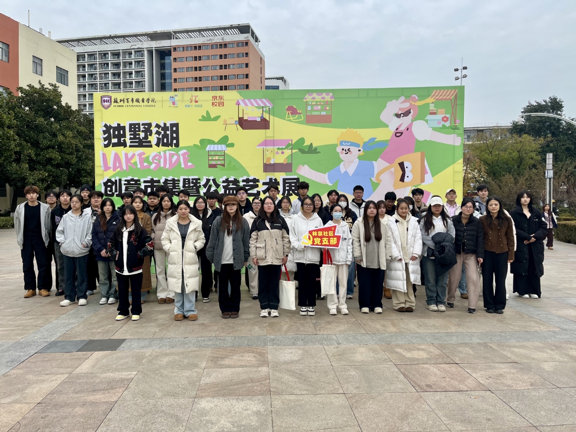 2025年12月10日,由数字经济与管理学院联合艺术与创意设计学院举办的“数艺融创”系列活动之独墅湖“LAKESIDE”创意市集暨公益艺术展在文星广场圆满落幕。活动紧扣五育融合实践教育要求,以 2024 级专业实训周为依托,将职业认知、专业实践、文化传承与资源循环深度结合,为师生及周边居民打造了一场兼具实践价值与文化活力的盛会。活动得到了中共苏州工业园区斜塘街道林泉社区支部委员会的大力支持。