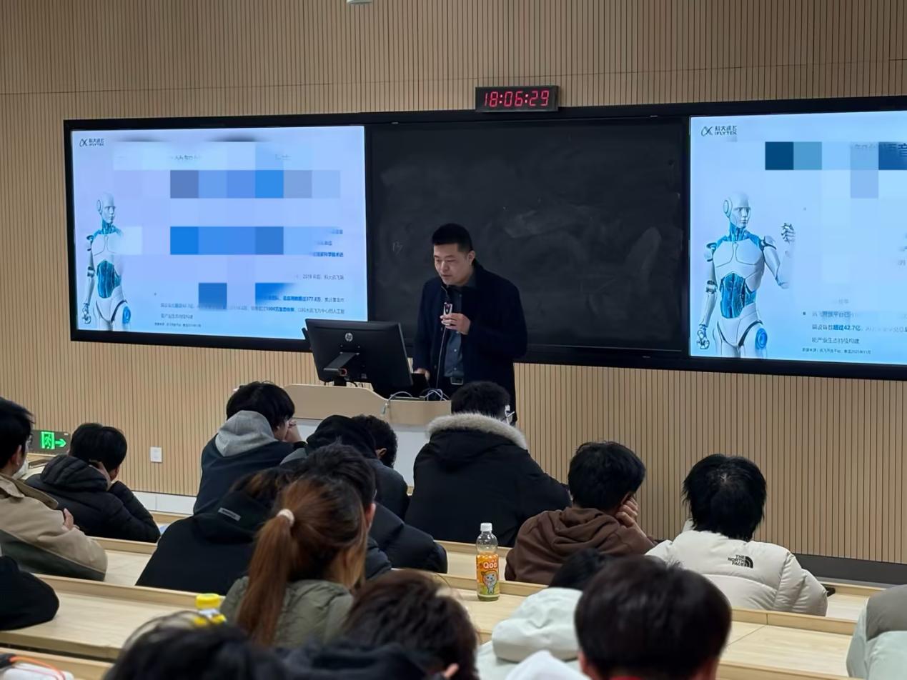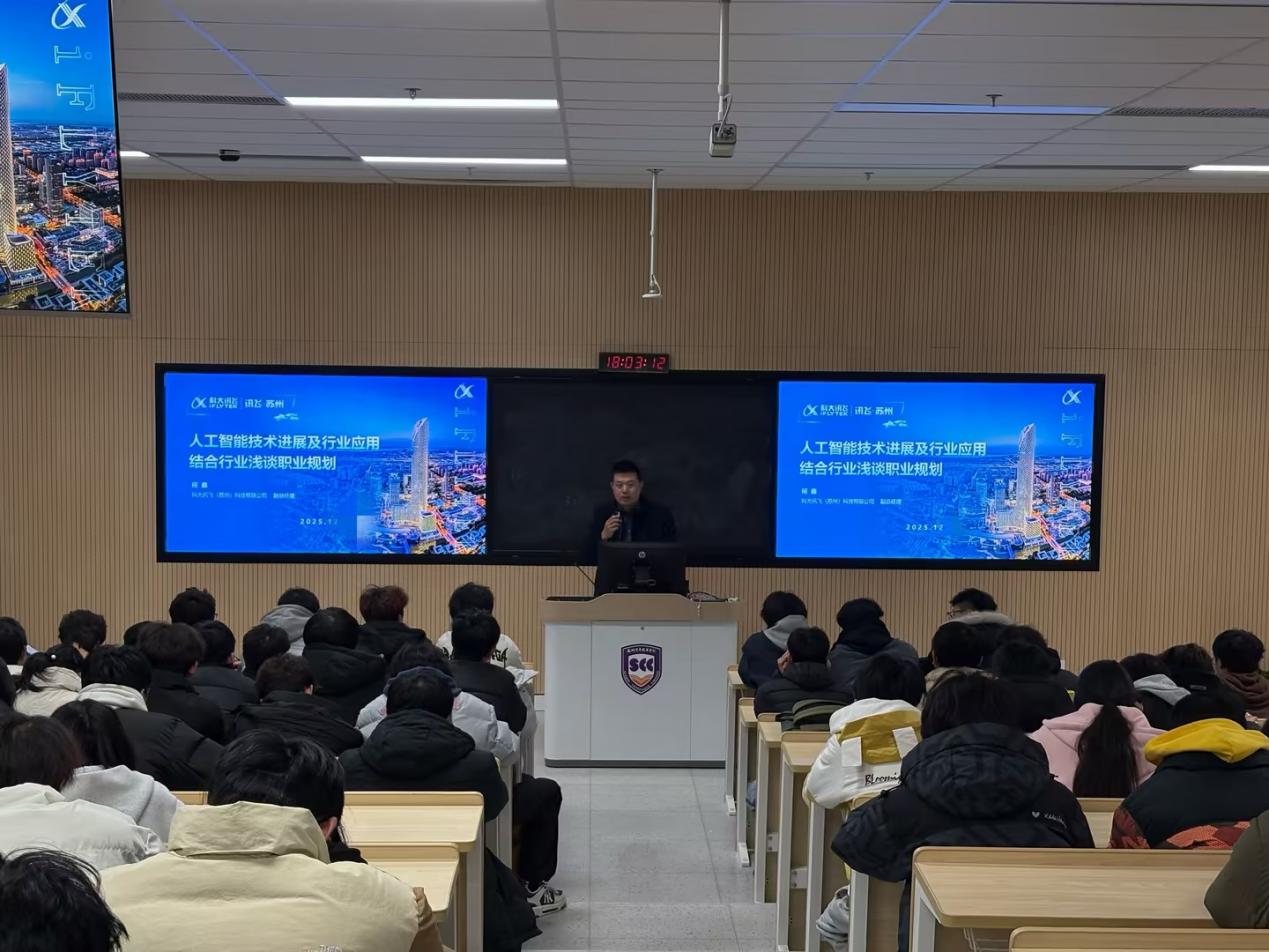 2025年12月16日晚,科大讯飞(苏州)科技有限公司副总经理何鑫应邀来到9999js金沙老品牌,为人工智能与大数据学院2025级学生作“人工智能技术进展及行业应用——结合行业浅谈职业规划”主题讲座。相关专业班级学生到场聆听。