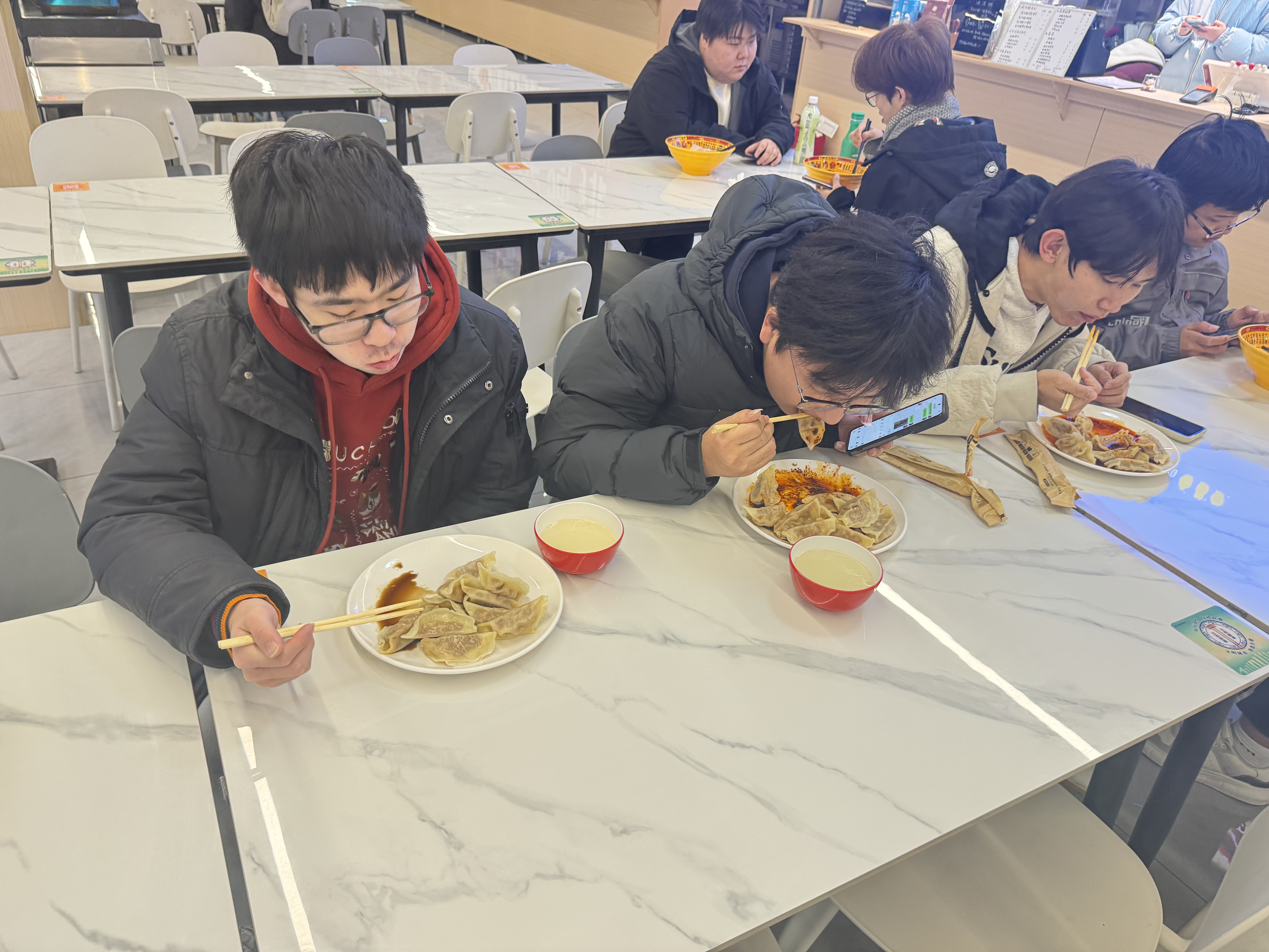 活动现场,食堂窗口前秩序井然。工作人员与志愿者分工明确、协同配合,引导同学们有序排队、依次领取。热腾腾的饺子刚出锅便香气四溢,蒸汽氤氲间,同学们端着饺子拍照分享、笑语不断,现场洋溢着浓浓的节日氛围与暖心情意。对不少在外求学的同学而言,这一口“冬至饺子”不仅是节气里的仪式感,更是校园送来的“家的味道”,让人倍感踏实与温暖。
