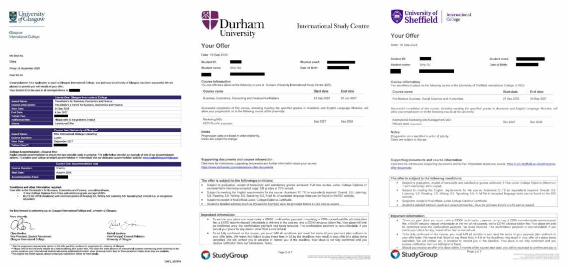 近日,金沙官网数字经济与管理学院2023级市场营销专业学生徐诗怡陆续收到英国谢菲尔德大学、格拉斯哥大学、杜伦大学三所QS世界大学排名百强高校的硕士预录取资格,成为学院海外升学人才培养的又一亮点。