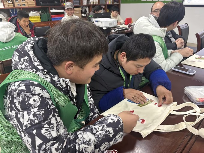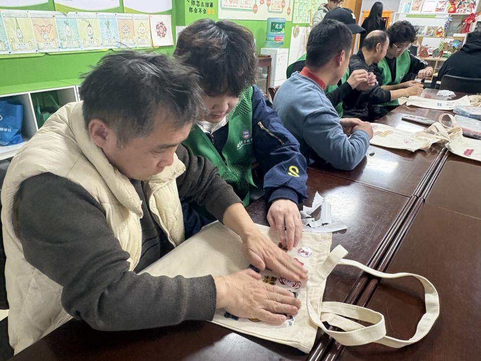 宣讲结束后,活动进入手工彩绘环节。志愿者们准备了环保布袋和无毒颜料,邀请残障人士一起动手,用画笔表达对“安全”的理解。志愿者们耐心陪伴在每一位参与者身旁,帮助他们勾勒出“盾牌”“锁”“网络安全”等图案,有的参与者还写下了自己设计的反诈口号。在志愿者的悉心指导下,每一位参与者都完成了一个个独一无二的“反诈环保袋”。