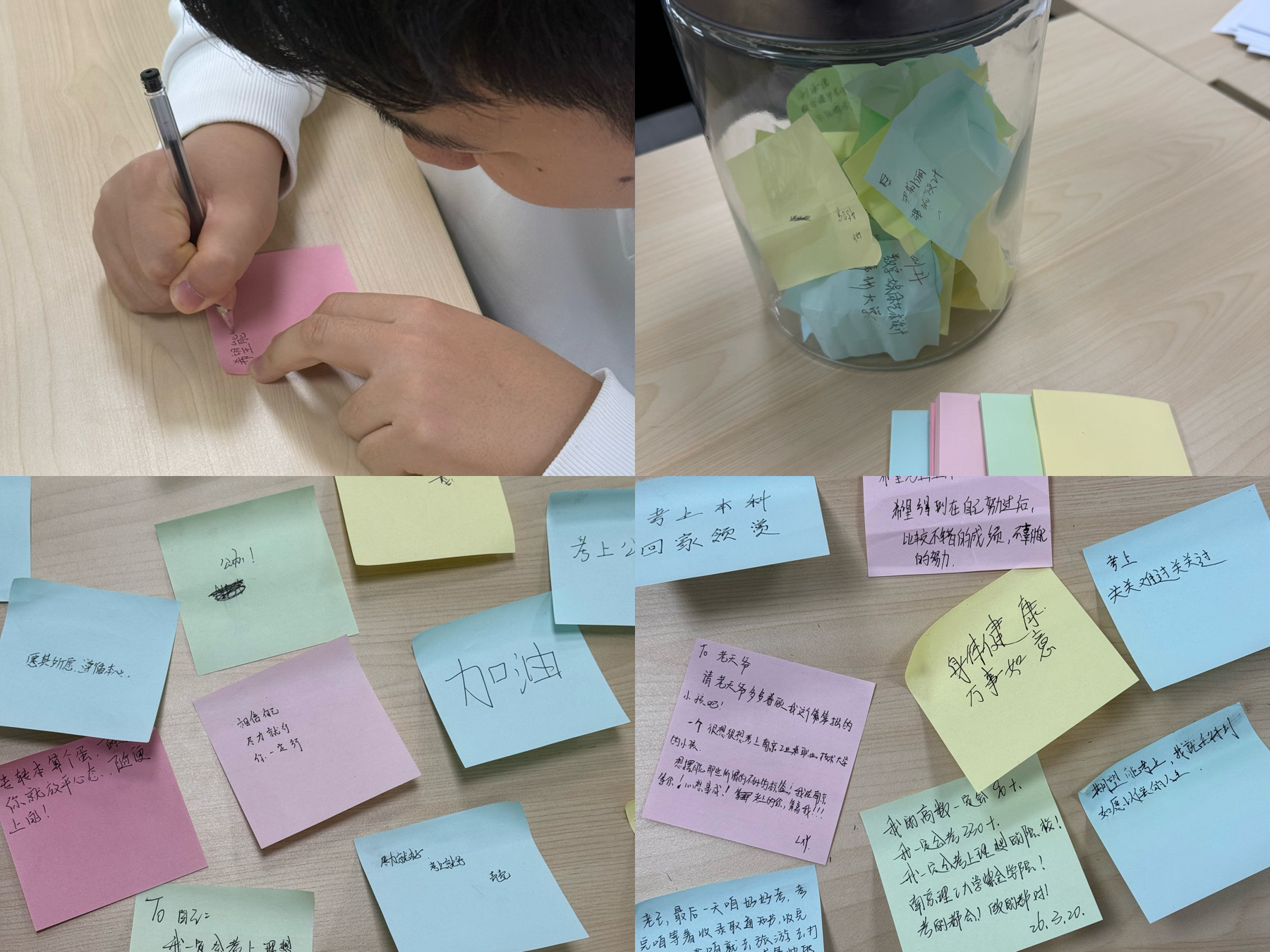 现场氛围轻松有序,同学们积极参与互动分享,通过色彩与文字表达情绪、写下心愿,进一步缓解了备考紧张感,增强了应试信心。