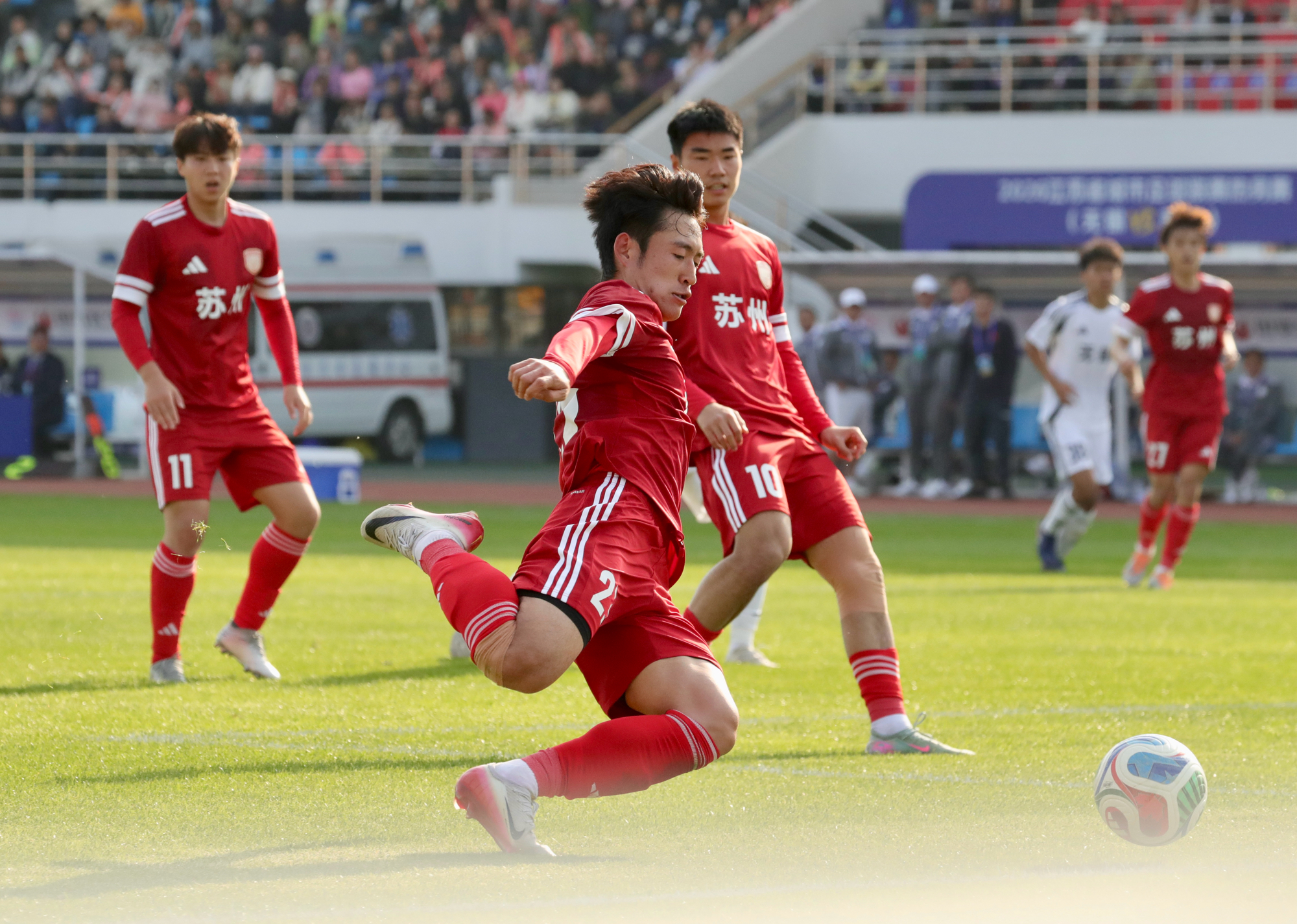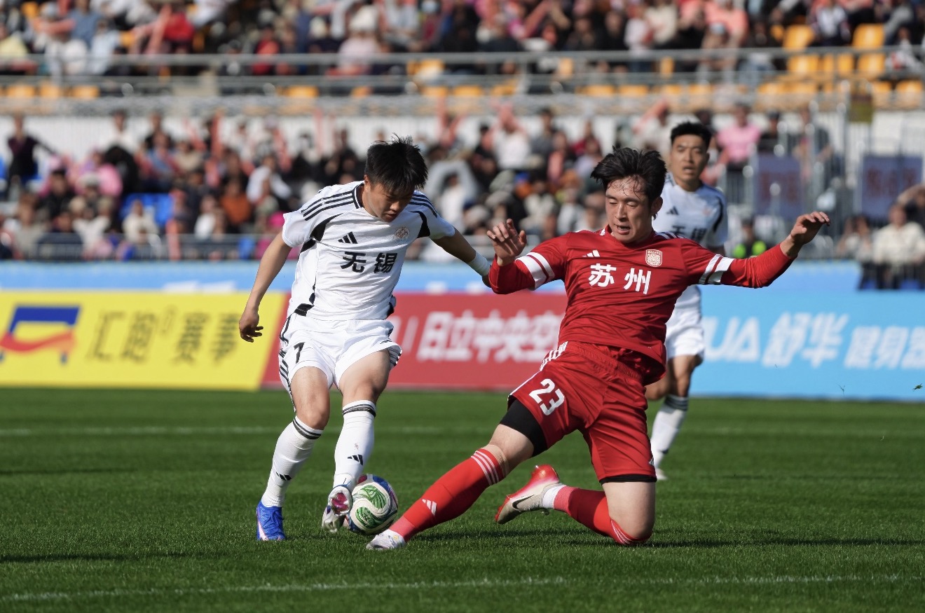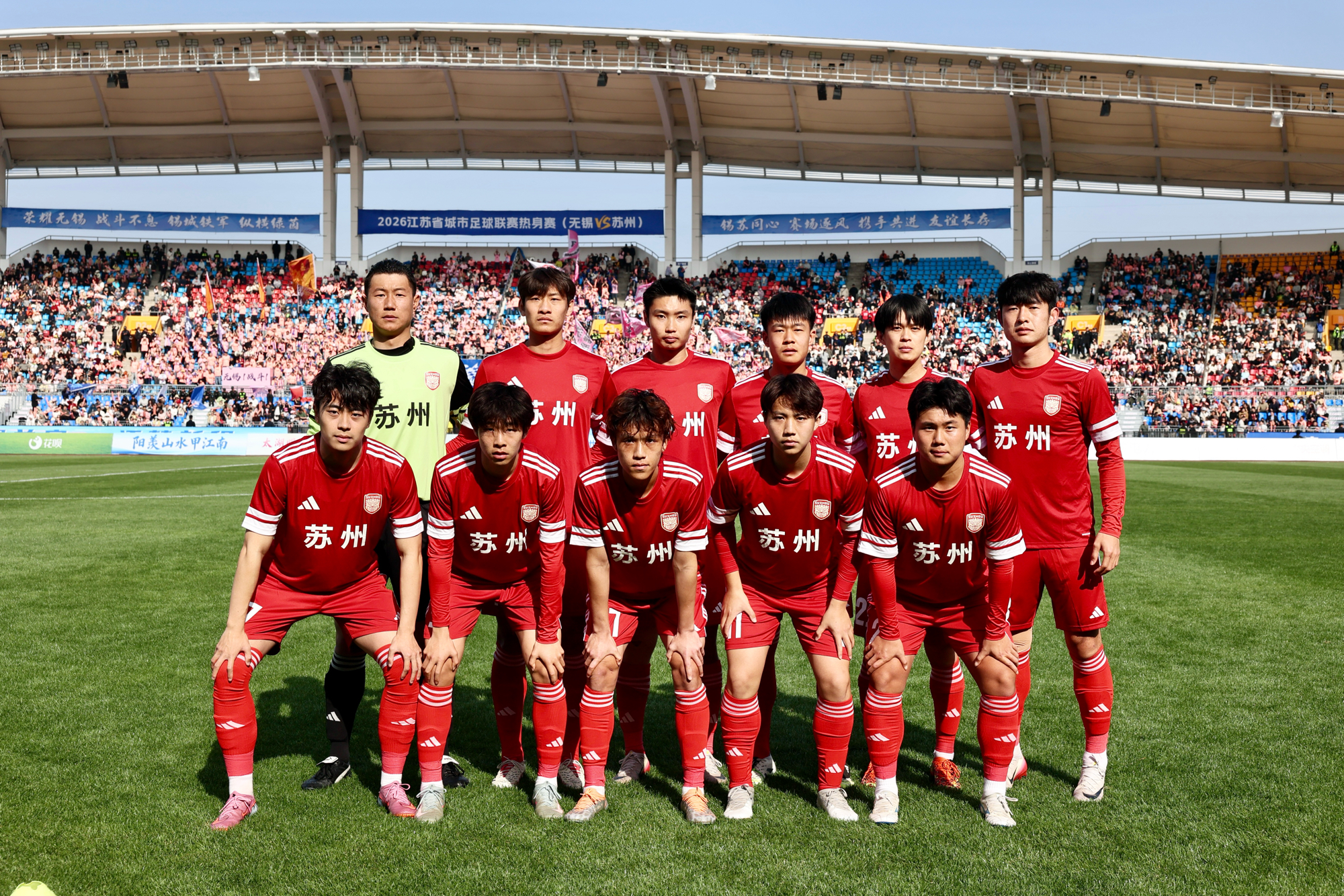 3月28日,2026年江苏省城市足球联赛热身赛在宜兴市体育中心体育场激情开赛,苏州队客场对阵无锡队。金沙官网足球队队长、数字经济与管理学院2023级学生麻轩瑞身披23号球衣代表苏州队首发出战。热身赛现场共有20059名球迷观战,比赛氛围热烈,看台上不时响起阵阵助威呐喊声,旌旗招展,鼓点激昂。