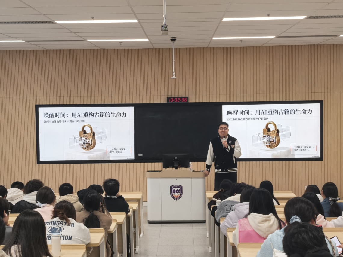 为深入推动中华优秀传统文化创造性转化、创新性发展,搭建古籍与人工智能跨界融合的交流平台,4月1日,艺术与创意设计学院在躬行楼(阶一)成功举办“当古籍遇见AI:古籍活化共创分享会”。苏州广播电视总台资深媒体人陈泓伯老师受邀担任主讲嘉宾,围绕“首届苏州市古籍AI活化共创大赛”,为现场师生带来了一场兼具思想性、实用性与创新性的文化盛宴。