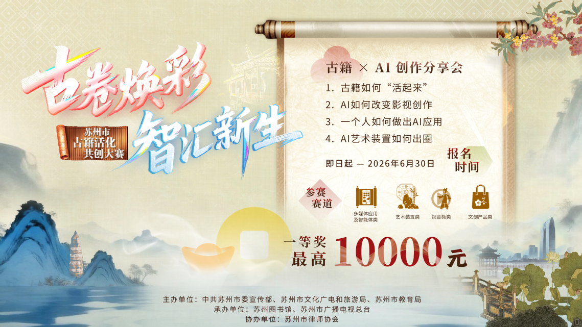 据悉,“首届苏州市古籍AI活化共创大赛”由中共苏州市委宣传部、苏州市文化广电和旅游局、苏州市教育局联合主办,苏州图书馆、苏州市广播电视总台承办,苏州市律师协会协办,是贯彻落实全市文化繁荣发展部署的重要举措。大赛以“古籍共创活化利用”为核心理念,精选《清嘉录》《吴郡岁华纪丽》等八本吴地特色古籍作为创作蓝本,设置多媒体应用及智能体、艺术装置等四大赛道,鼓励参赛者运用AI技术对古籍素材进行创意转化,让沉睡千年的古籍在数字时代焕发新生。