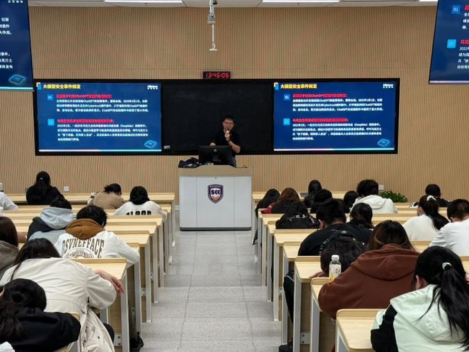 讲座中,吴运文老师立足当下国内外网络安全新形势,结合勒索软件攻击、DDoS攻击、供应链攻击、数据泄露、AI安全、关键基础设施防护等近年典型网络安全事件,深度剖析行业面临的机遇与挑战。他以通俗形象的语言拆解网络安全攻防逻辑、解读网络攻击核心形态,将专业理论知识转化为生动易懂的内容,让在场学生直观理解网络安全的重要性与现实紧迫性。针对大学生日常学习生活场景,吴老师重点提醒,切勿因小利随意扫描不明二维码、务必核验信息来源权威性,在公共场合谨慎连接免费WiFi,切实强化个人信息保护意识,筑牢自身网络安全防线。